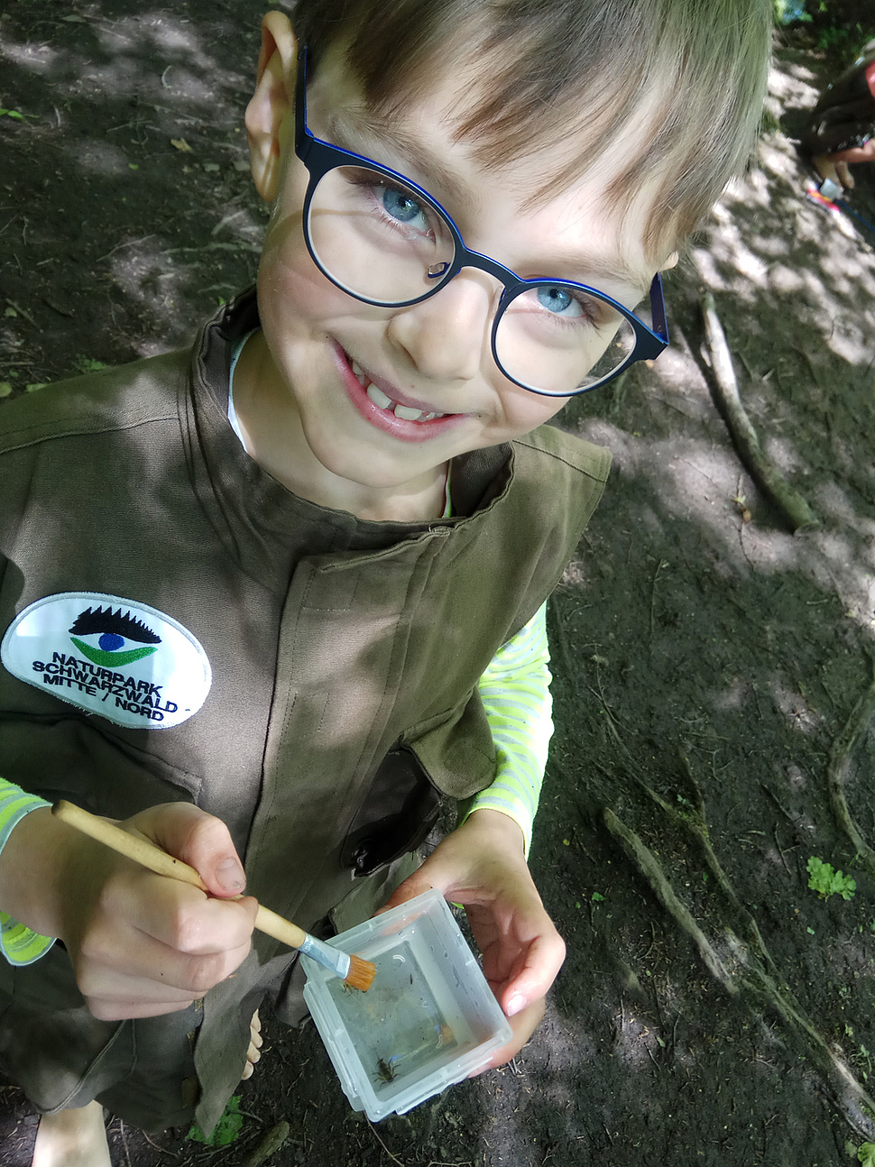 Schließlich die letzte Etappe unserer Fahrt: Manuela Riedling, die als Naturpädagogin im Naturpark Schwarzwald Mitte/Nord tätig ist, hatte an einer sonnigen Flußinsel eine Überraschung für uns: Jeder erhielt von ihr eine Entdeckerweste mit Kescher, Pinsel, Lupe und Notizblock. Damit gingen wir auf Suche nach den Kleinstlebewesen in der Moosalb. So fanden wir Köcherfliegenlarven, Stein- und Eintagsfliegenlarven - alles Beweise dafür, dass die Moosalb sehr sauberes Wasser im Sinne von "sauerstoffreich" führt. Sogar einen Blutegel konnten wir entdecken, dazu viele Flußkrebse und einige Strudelwürmer. Wir erfuhren Wissenswertes über die Tiere: dass es sie seit Millionen von Jahren gab und dass die Larven viele Monate leben. Die Fliegen jedoch sterben nach wenigen Tagen. Ganz spannend auch, dass aus einer Körperzelle eines Strudelwurmes ein kompletter neuer Strudelwurm nachwachsen kann. So erkundeten wir in zwei kurzweiligen Stunden die Moosalb mit ihren zahlreichen kleinen versteckten Tierchen.