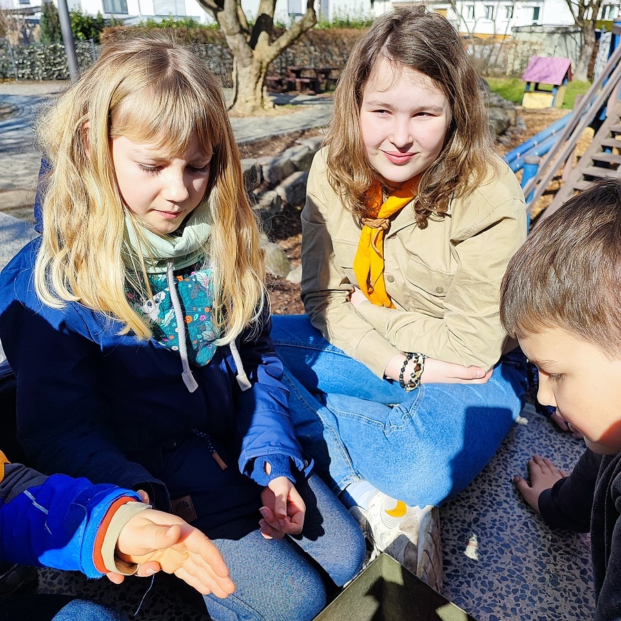Den Steinen folgten wir immer weiter, bis wir vor den Ufern der Pfinz standen. Jetzt mussten wir uns was überlegen, trocken über das Gewässer zur andere Uferseite zu kommen, um am letzen Stein wieder eine Kompasspeilung zu machen. "24 Meter Nord-Ost" war die Richtung, die wir einschlagen mussten. Und genau an dieser Stelle war ein altes Tau an einem Baum geknotet. Wir hielten uns alle an einer Hand und bildeten so eine Kette, um den steilen Hang bis zum Flussbett hinunter zu kommen. Da es die letzten Tage viel geregnet hatte, war auch die Pfinz gut mit Wasser gefüllt. Am Seil angekommen zogen wir mit vereinten Kräften das Tau aus dem Wasser. Am Tau hing eine alte Metallkiste, die aus dem Fluss hervorkam. Jetzt waren alle gespannt, was in dieser geheimnisvollen Kiste versteckt wurde. Mit Hilfe der Nummern der Steine und der Entfernung der Strecke hatten wir die Kiste in wenigen Sekunden offen. Alle staunten, als sie sahen was für ein Schatz in der Kiste verborgen war. Es waren Edelsteine, Diamanten und Goldmünzen darin. Doch was allen am meisten gefallen hatte, war der nächste Hinweis auf einen noch viel größeren Schatz, den wir auch noch finden wollen. Dieser verborgene Schatz war erst der Anfang.